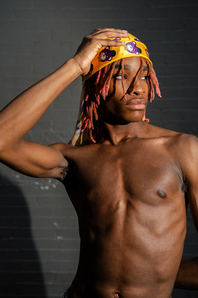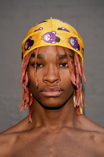 Celebrating 25 years as a designer: The “Golden ICON Purple Bear” silky durag in gold is part of the new Jason C Peters brand. It is a LIMITED EDITION item meaning once it is sold out it will not return to the collection! The durag is unisex and is one size fits all to ensure that everyone can be part of my brand!
